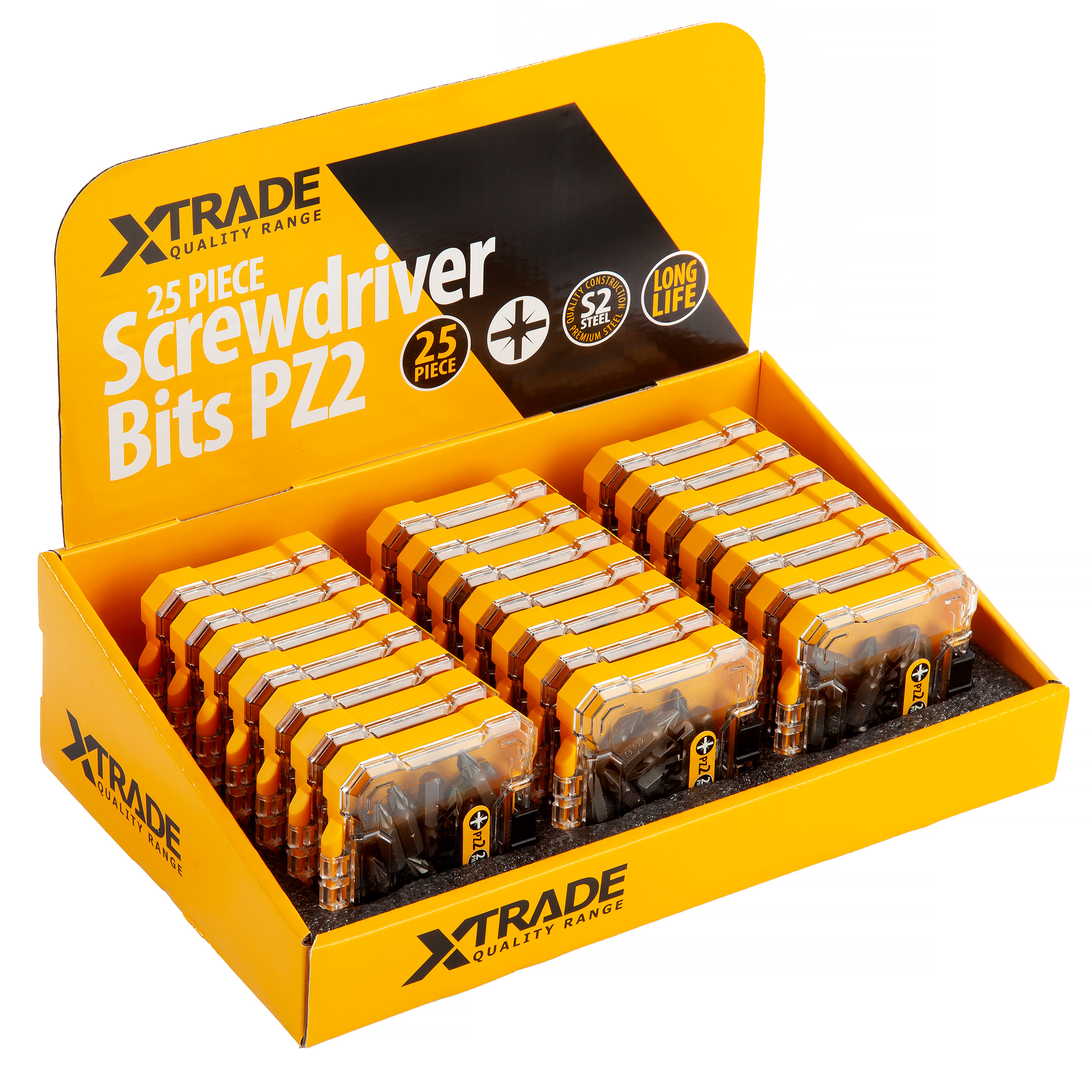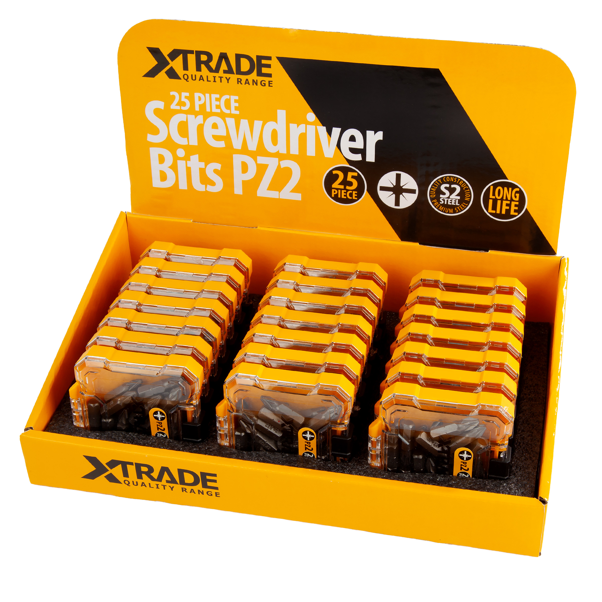 Introducing XTrade Screwdriver Bits designed for professional use. Manufactured with ‘S2’ premium steel for long life and suitable for all heavy-duty screwdriving applications. Measuring 25mm in length and supplied in a 25-piece handy storage case.